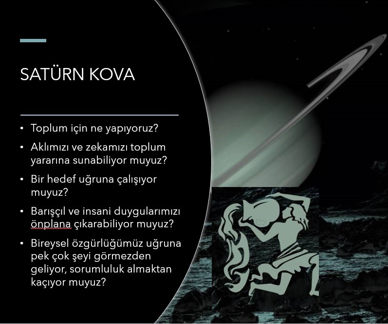 Satürn Kova’da, kovanın olumlu ifadesini hayatımıza geçirmemizi bekler; Aykırı olmayı göze alarak yenilikçi ve insancıl fikirler ortaya koymak ve bunları toplum yararına sunmak, toplumun iyiliği için çalışmak. Bunu yapabilmek için, kişinin önce kendini bilmesi, kendi farklılarını ve bireyliğini kabul etmiş olması gerekir. Satürn Kova’dayken, bizler, toplumsal alanda, birbirimize olan sorumluklarımızla, yaklaşımımızla, birbirimize verdiğimiz değerle, eşitlik anlayışımızla sınanırız. Bu dönemde; toplumsal düzenin yenilenmesi, yeni bakış açıları, yeni örgütlenmeler, yeni organizasyonel yapılar , yeni teknolojiler, yeni bilgiler hep gündemimizde olacak. Geçen yıldan beri konuştuğumuz , oğlak burcundaki bireysel yapılanma çalışmalarını yaparak, kendilerini artık yeni bir birey olarak ifade edebilenler için yeni dönem toplumun yararına olan konularla ilgili olacak.
