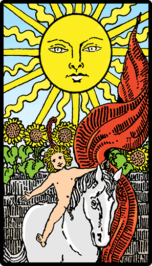 mutluluğu okunmakta. Başında güneş küresi 6 güneşli bir taç var. Artık o arkadaki duvarların gerisinde kalan karanlıktan kurtulup görünen dünyada, tüm yaşanmışlığın ışın olarak birleştiği güneşle aydınlanan yolda ilerlemekte. Karanlıklar üzerinde elde ettiği ruhsal zaferini gösteren, sol elinde salladığı kırmızı flama bir kere daha arzu ve enerji ile dolduğunu ve yeni bir yola koyulduğunu göstermekte.” Tarot Sırları-Rezzan Kiraz
