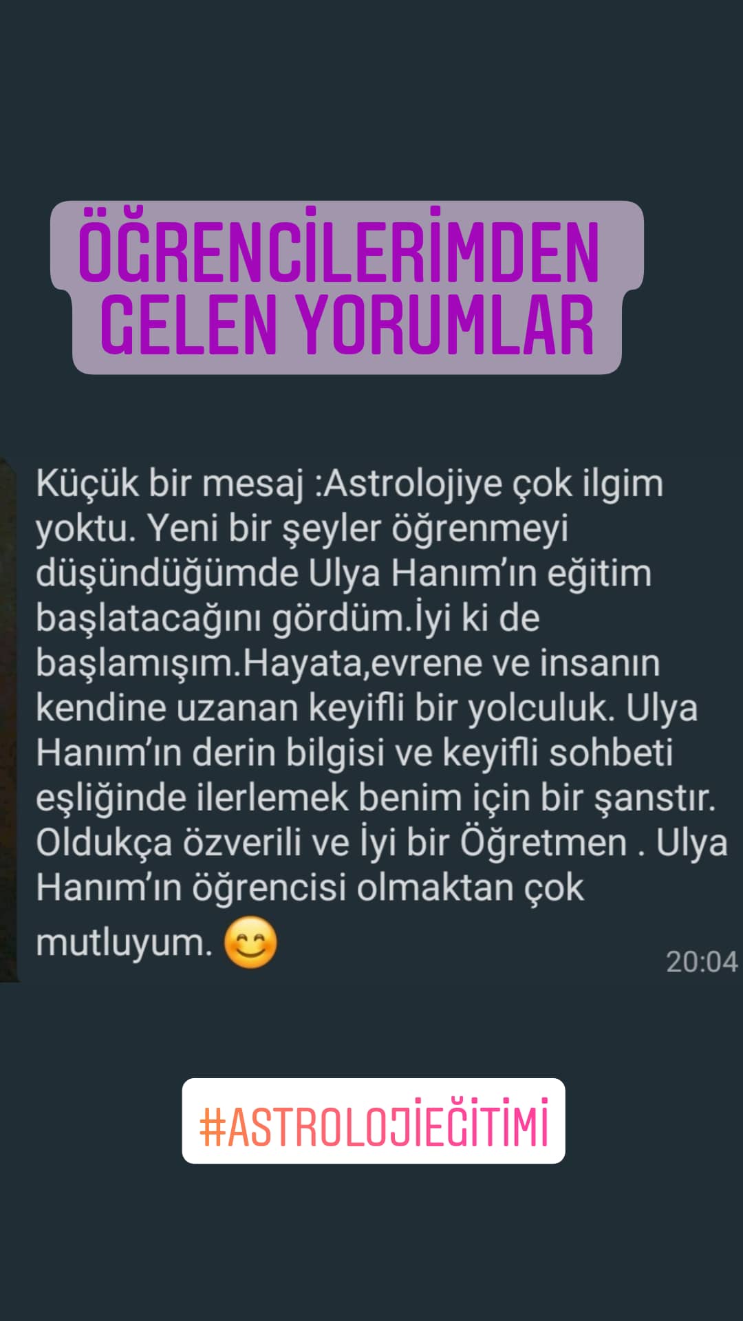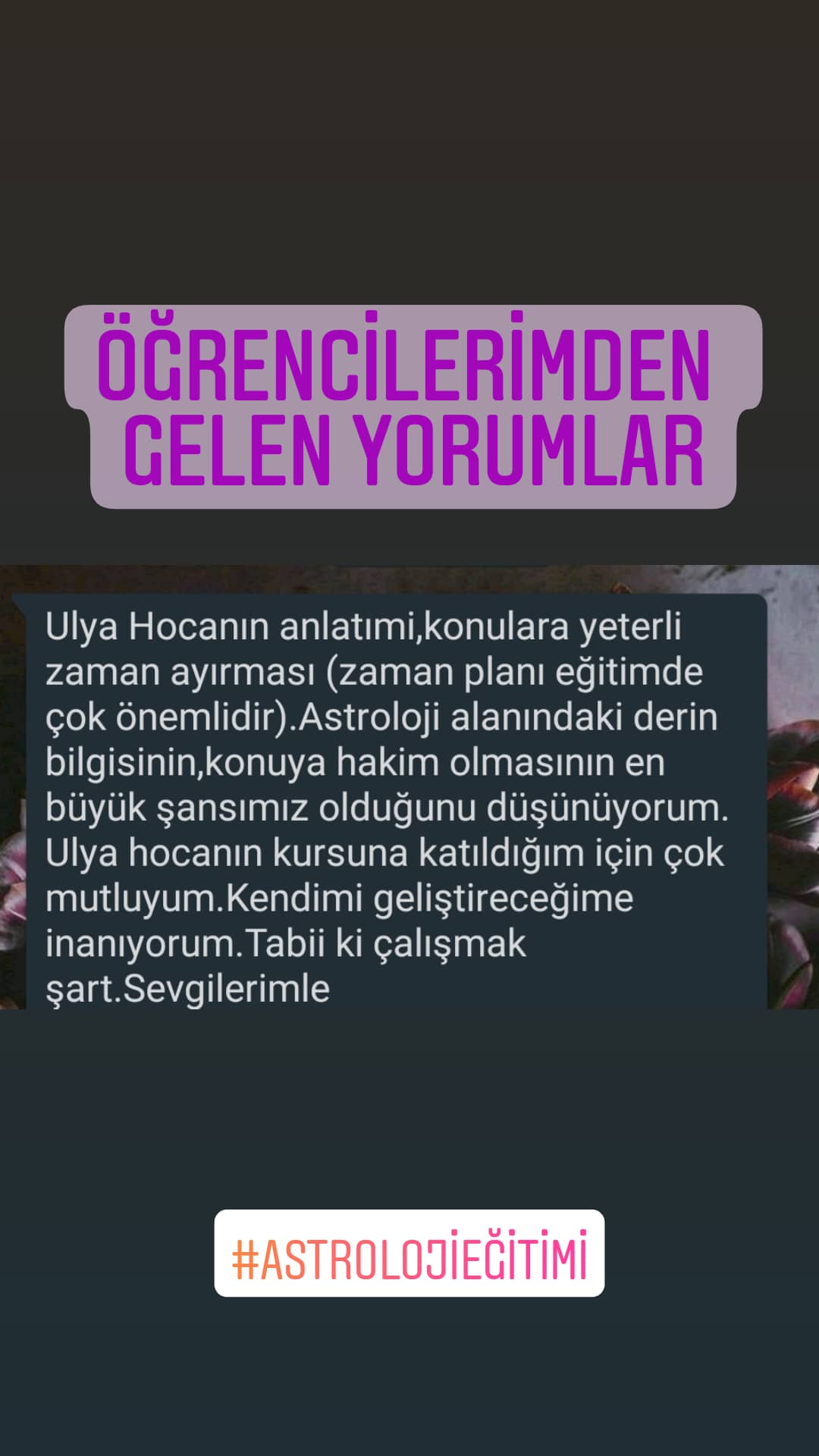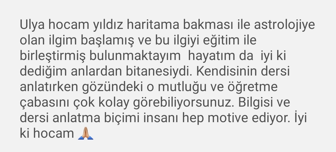 Astroloji Eğitimi sadece Kadim bir ilimi öğrenmek değil, ‘öncelikli olarak’ kendine ulaşacağın uzun bir yolculuğa çıkmaktır. Ben, Astroloji’nin insan gelişimi ve tekamülü yolunda sağladığı faydalara bu işe başladığımdan beri hayran oldum. Bu nedenle, herkesin kendi haritasını biliyor olması gerektiğini düşünüyorum. Bu iki yolla; danışmanlık alarak veya temel seviye Astroloji bilgisine hakim olarak olabilir.