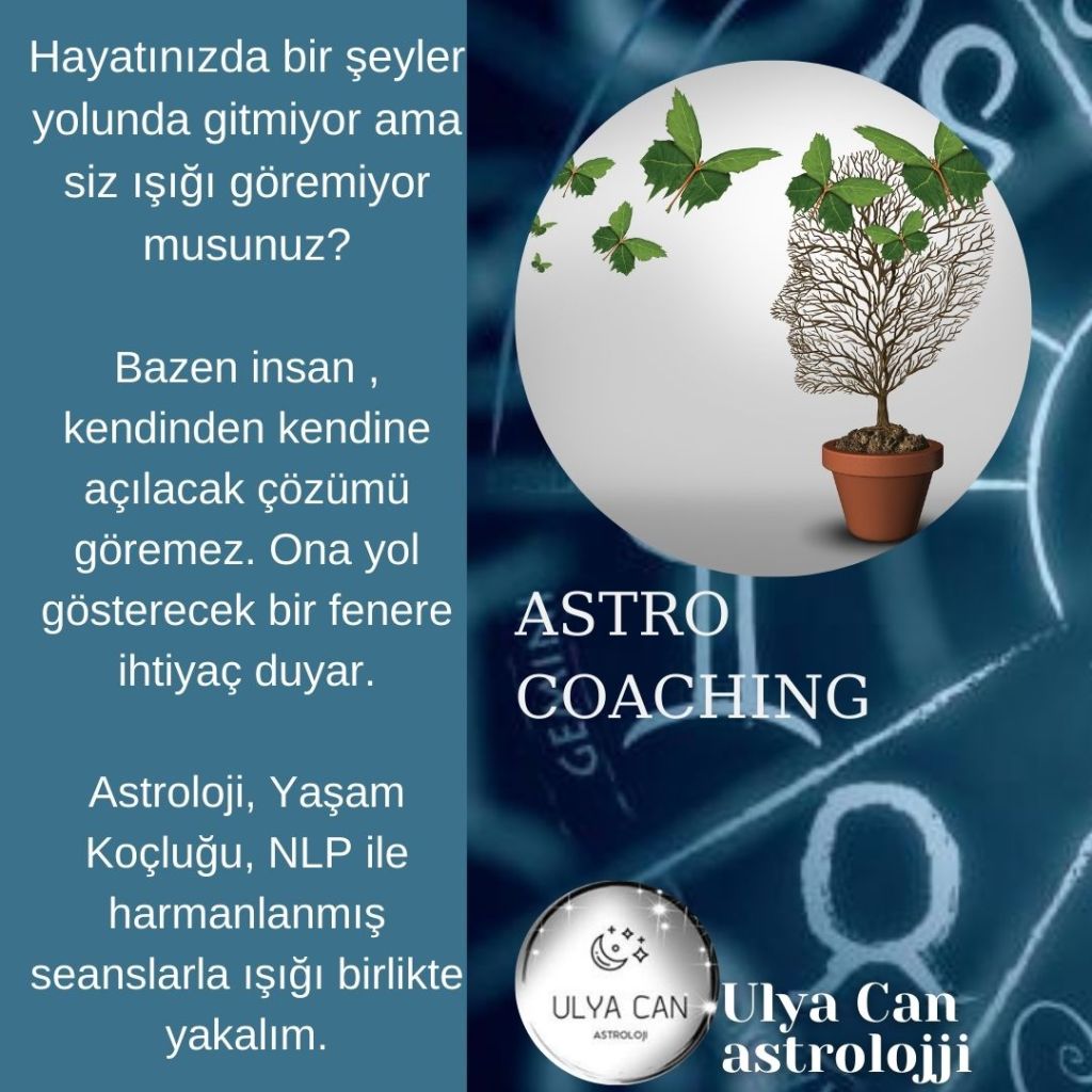Astro Coaching; İçinde bulunduğumuz değişim/dönüşüm döneminde, potansiyellerinizi ve yeteneklerinizi yeniden değerlendirmek, yaşamınıza yeni bir yön ve bakış açısı verebilmek mi istiyorsunuz, öyleyse Astro Coaching tam size göre. Birebir yapacağımız seanslarda, doğum haritası potansiyellerinizi, güncel enerjilerden aldığınız etkiler ile değerlendireceğiz. İlerlemeye ihtiyacınız olan konuya göre; meslek ,kariyer, ilişki, çocuklar, yaşam amacı, ruhsal yolculuk gibi konularda astrolojik analiz ile birlikte NLP, Yaşam Koçluğu , numeroloji gibi teknikleri birleştirerek, güncel enerjilere göre yol haritanızı çıkaracağız. Astro coaching seans içeriği sizin ihtiyaçlarınıza göre sadece size özel olarak oluşacak. sayısını da ihtiyacınıza göre siz belirleyebilirsiniz. (4 ila 6 seans tavsiye ederim. Seans aralığı minimum hafta tavsiye ederim.)