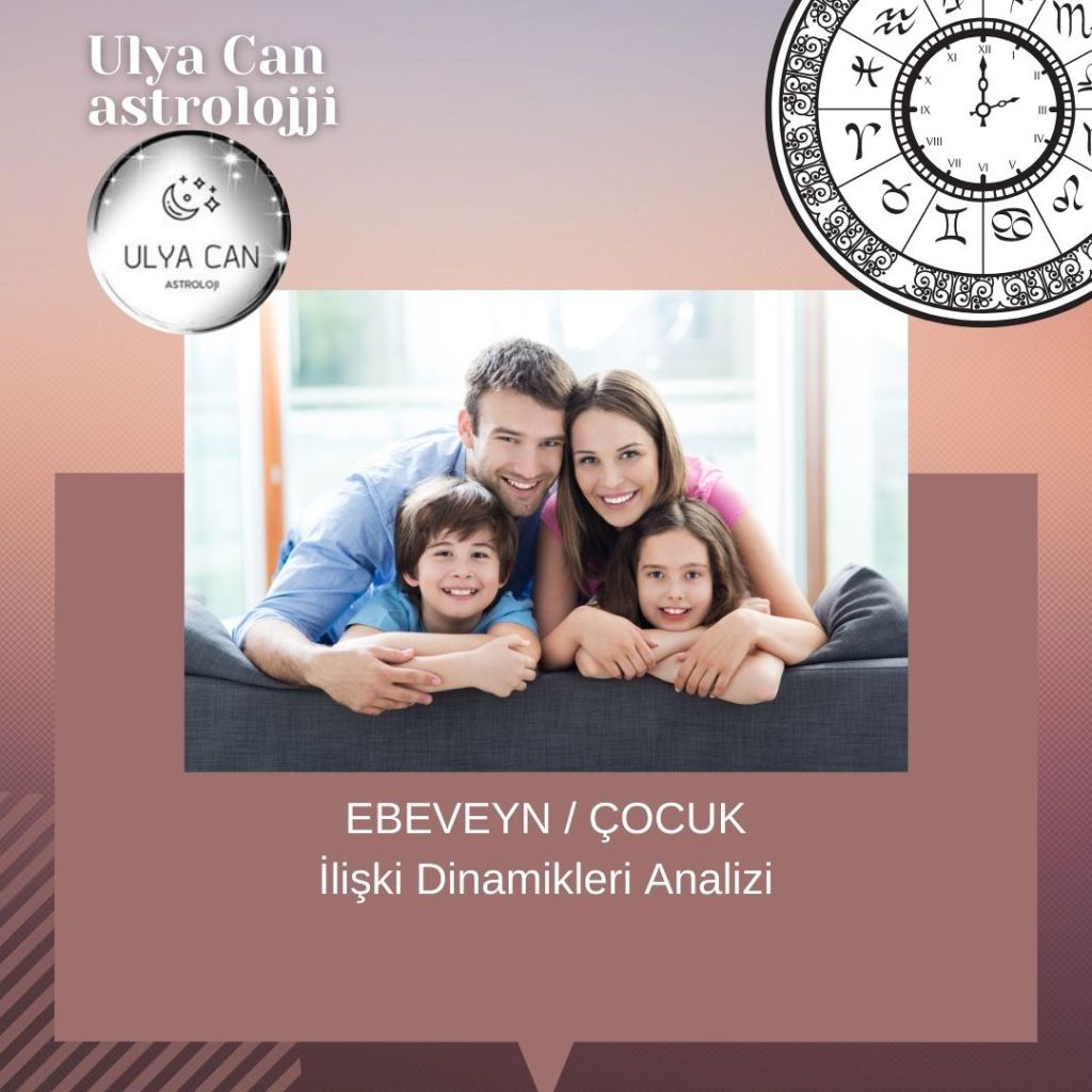 Ebeveyn/Çocuk Sinastrisi; Her çocuk ebeveynleri hakkında bir algıya sahiptir. Sizin çocuğunuz sizi nasıl algılıyor? Siz nasıl bir ebeveynsiniz? Çocuklarınızla ilişkilerinizde hangi dinamikler ağır basıyor? Karmik bağlarınız, kontratlarınız neler? Neden zorluklar yaşıyorsunuz? Karşılıklı birbirinizden öğrenecekleriniz neler? Çocuklarınızla iletişim ve ilişkileriniz için rehber niteliğinde bir çalışma.